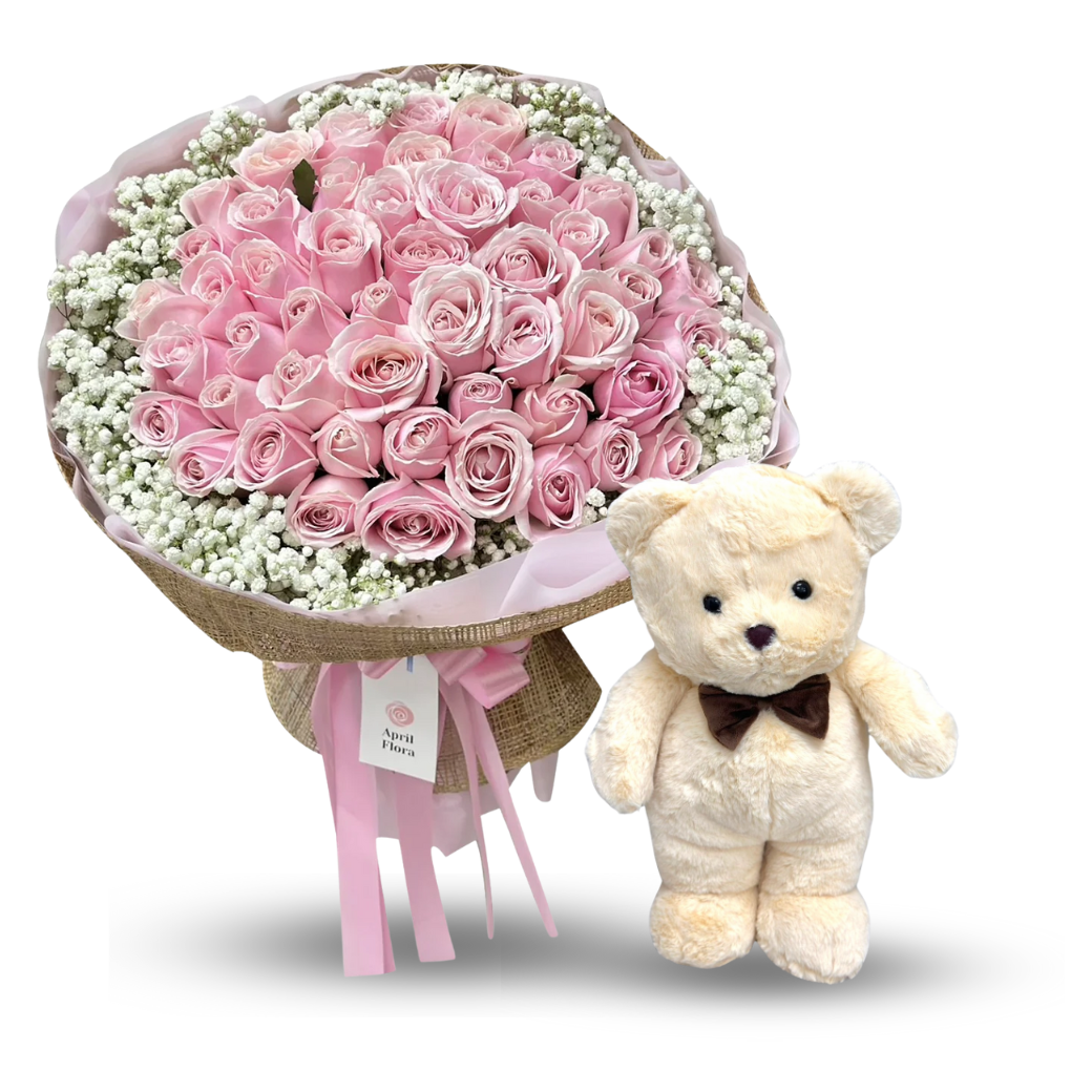 Elegant bouquet of 50 pink roses along with adorable Teddy Bear with Bow Tie (H 30 CM) This arrangement includes red roses and decorated with limonium/ gypsy. XL size - 50 roses XXL size - 100 roses ...