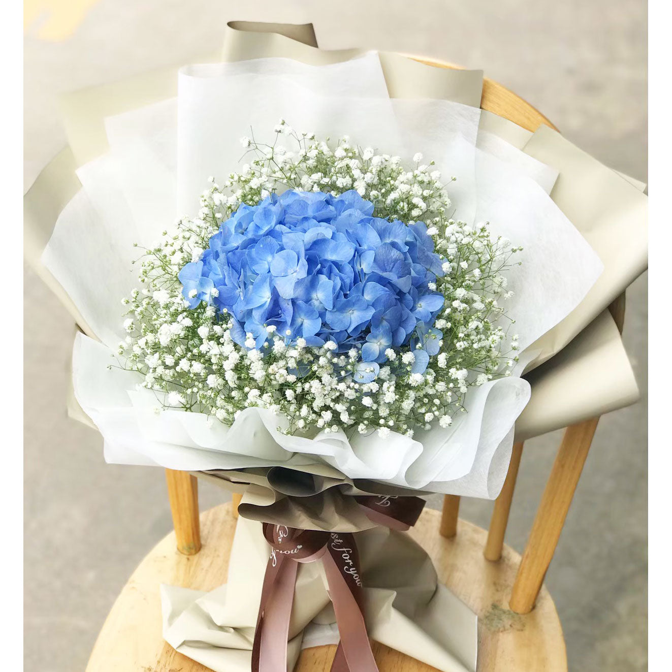 This arrangement includes pastel blue hydrangea and decorate with white gypso.