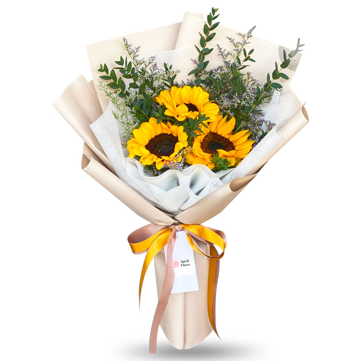 This arrangement includes sunflowers and decorated with eucalyptus and Caspia leaves.
